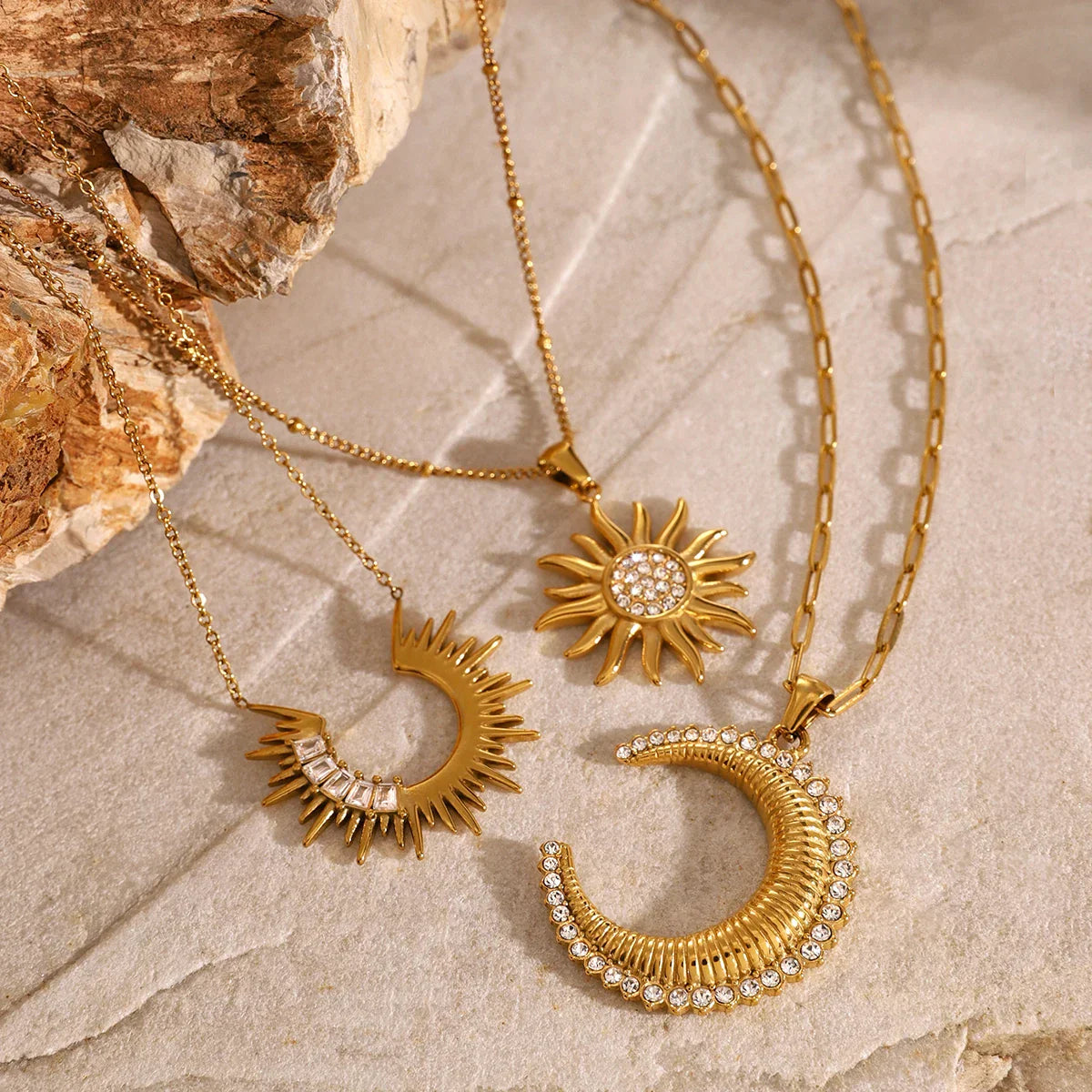 This striking necklace features a geometric design with a sparkling zirconia sun and crescent motif, perfect for adding a trendy touch to any outfit. Ideal for individuals who love unique jewelry, it's a great accessory for vacations or everyday wear. Whether treating yourself or searching for the perfect gift, this piece brings a sense of adventure and style, making it a must-have for any jewelry collection.