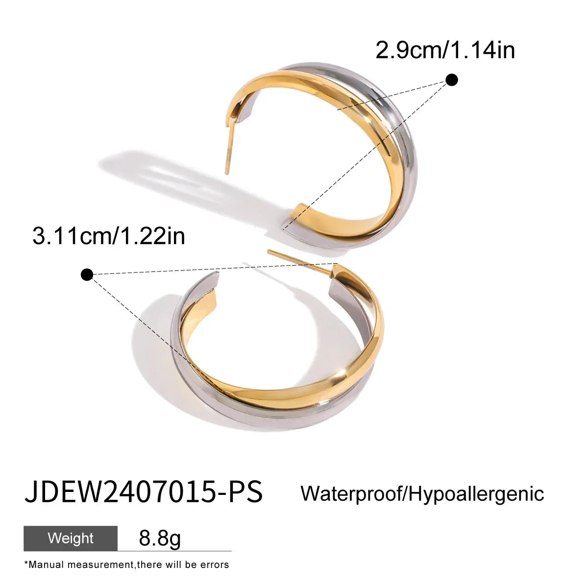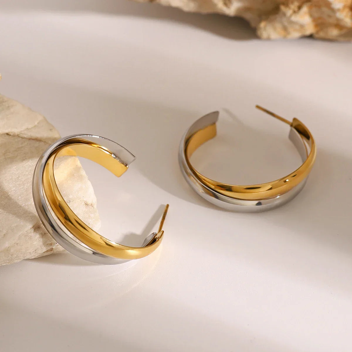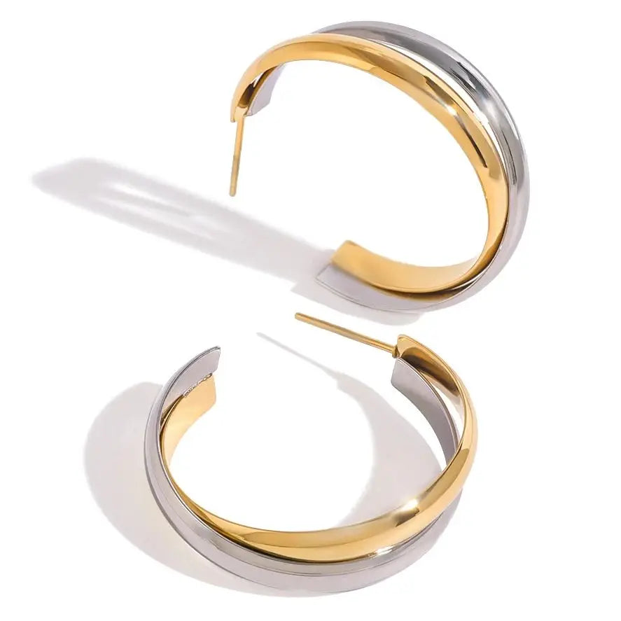 Stylish and durable, these double-layer C-shape earrings feature a sleek gold and silver plated finish. Their waterproof design makes them perfect for everyday wear, blending modern elegance with practicality for a bold yet refined accessory.