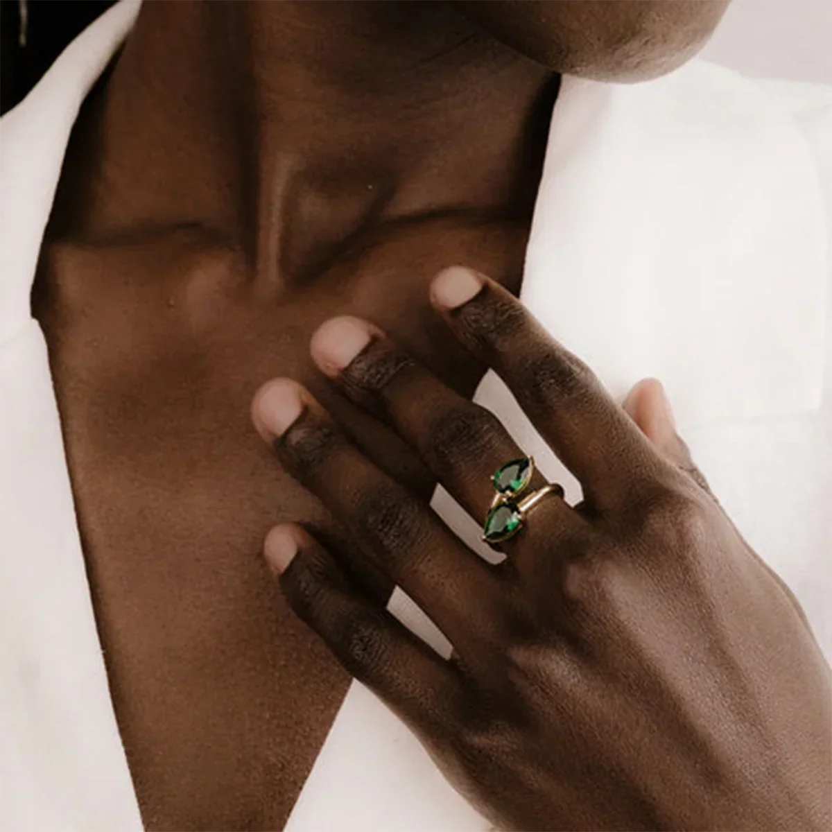Add a touch of luxury to your style with this Elegant Asymmetric Green Double Teardrop Zirconia Ring. Designed with two sparkling green teardrop zirconia stones and a unique hollow opening, this ring offers a modern, sophisticated look. Perfect for weddings, special occasions, or everyday elegance, it’s a must-have for women who appreciate beauty, charm, and refined craftsmanship.