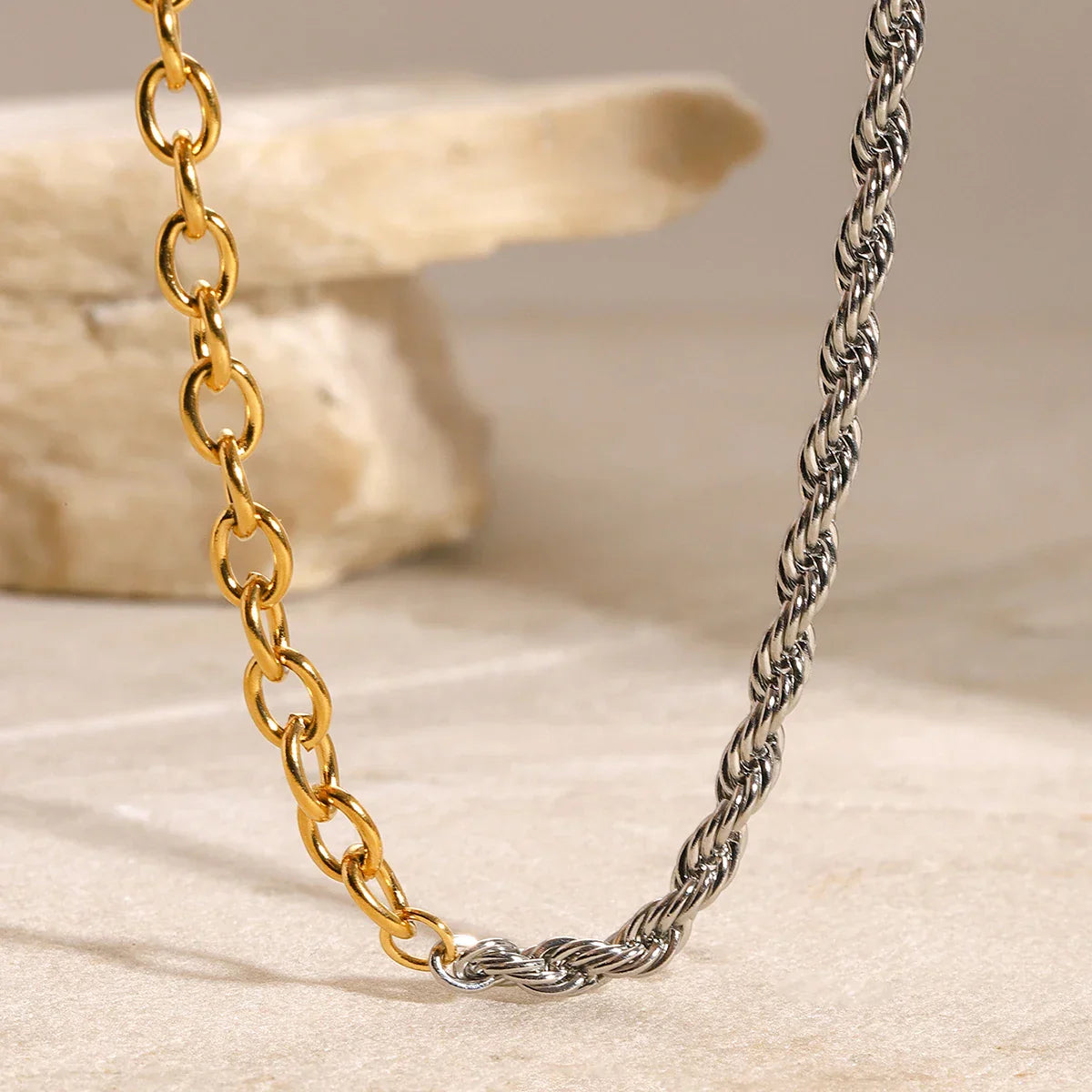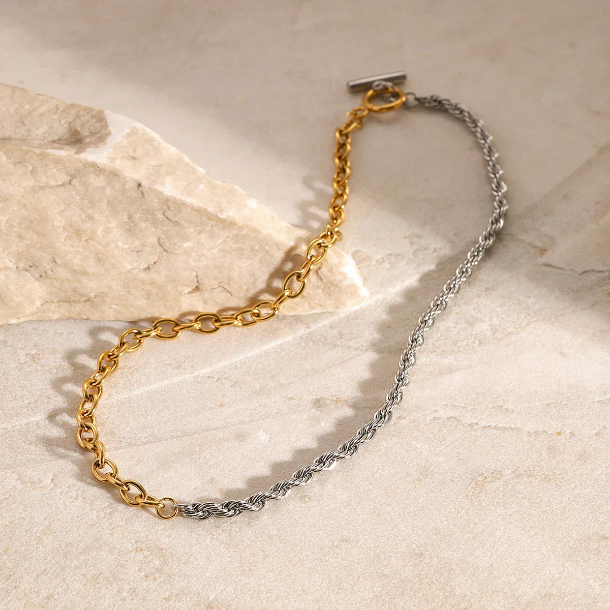 The Gold & Silver Chain Necklace-Bracelet Set is a bold blend of versatility and elegance. Designed for all, this unisex set features high-polish chains in mixed metallic tones — striking enough to stand out, subtle enough to layer. Crafted from waterproof, anti-allergic materials, it’s built for all-day comfort and 2024’s fast-paced fashion world. Whether you're dressing up or down, this set delivers effortless luxury that lasts.