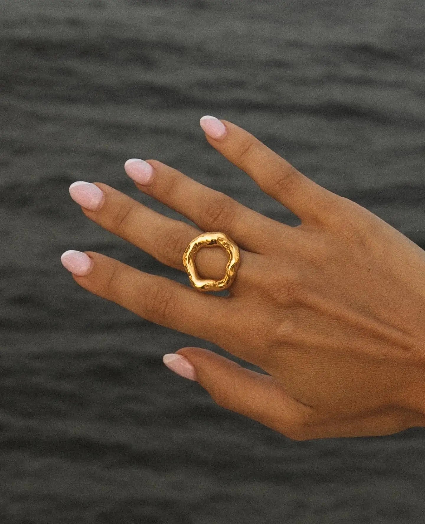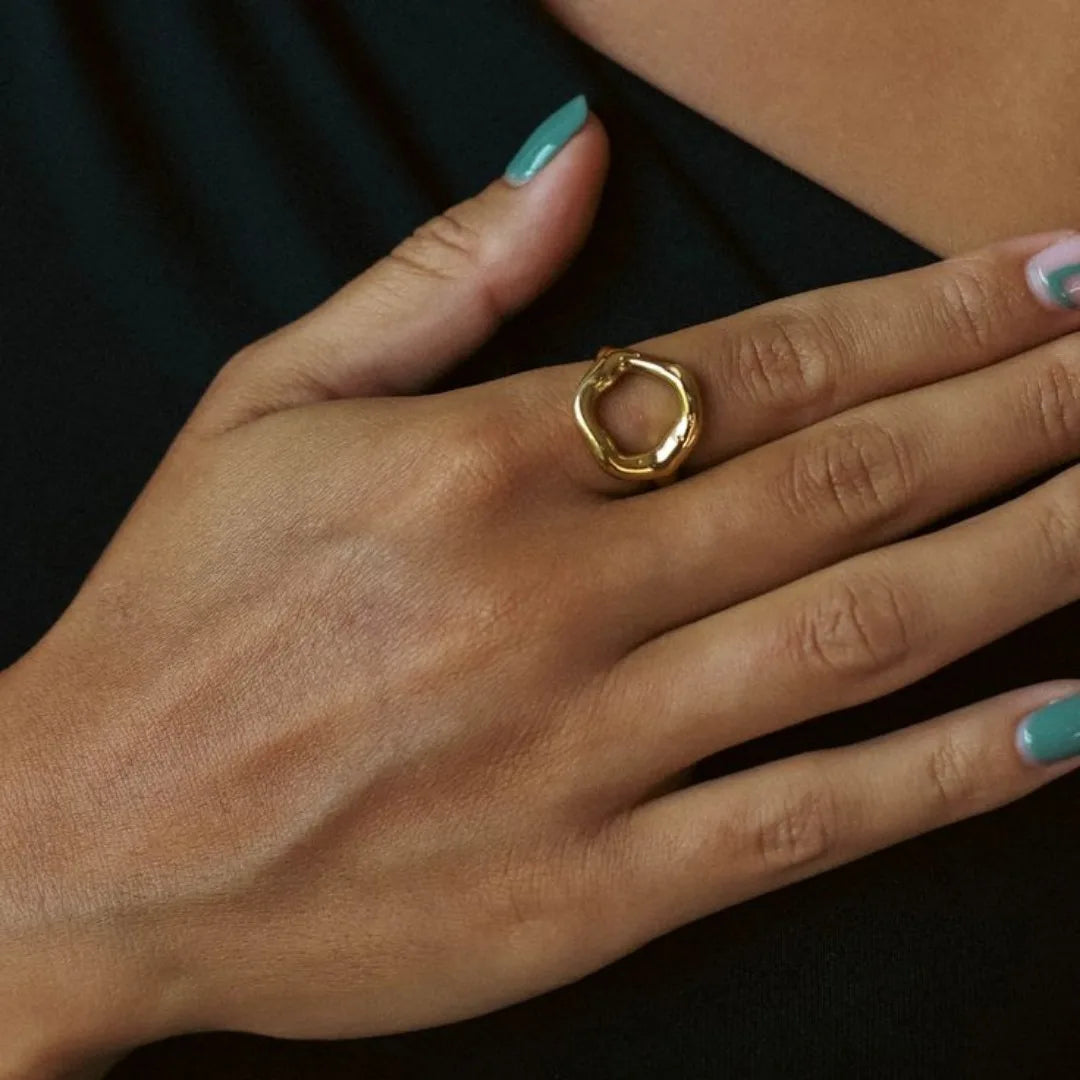 This distinctive ring showcases a unique circle motif with a striking melted texture, adding a modern and artistic touch to any look. Its gold-tone finish enhances its elegant appeal, while the waterproof design ensures durability and long-lasting shine. A perfect choice for women who appreciate stylish, sophisticated jewelry, making it an ideal gift for special occasions.