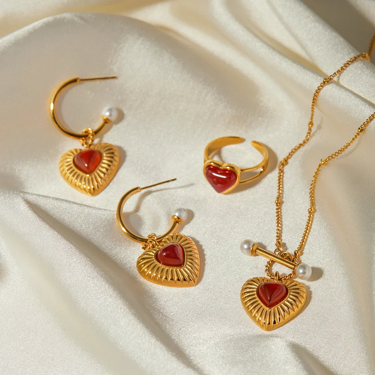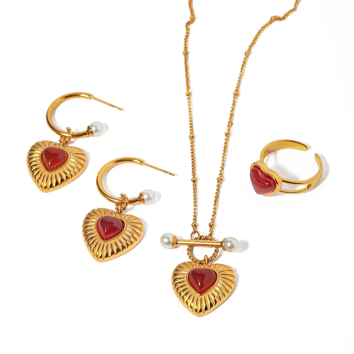 Introducing a stunning jewelry set featuring a beautifully crafted necklace, a heart-shaped ring, and elegant earrings designed for comfort and style. This set showcases a vibrant heart motif that adds a touch of romance and elegance to any outfit. Ideal for gifting, each piece combines timeless design with a modern flair, ensuring it will be cherished for years to come. Perfect for special occasions or as a heartfelt surprise for a loved one, this set is sure to make a statement. Enjoy the confidence of wearing hypoallergenic pieces, making them suitable for all skin types.